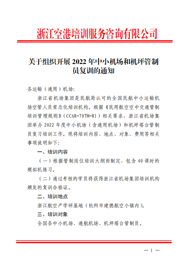關(guān)于組織開展 2022 年中小機(jī)場(chǎng)和機(jī)坪管制 員復(fù)訓(xùn)的通知.pdf